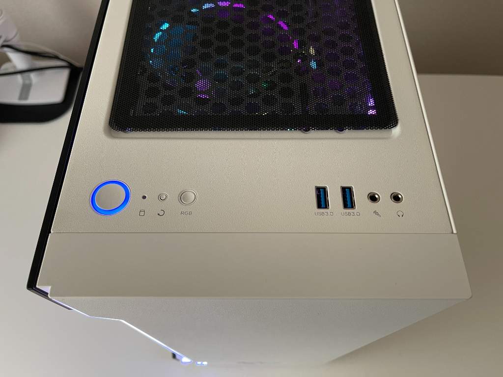 RGBボタンでカラー変更可、フルサイズのUSB3.0は2つ、オーディオジャックもあります。
